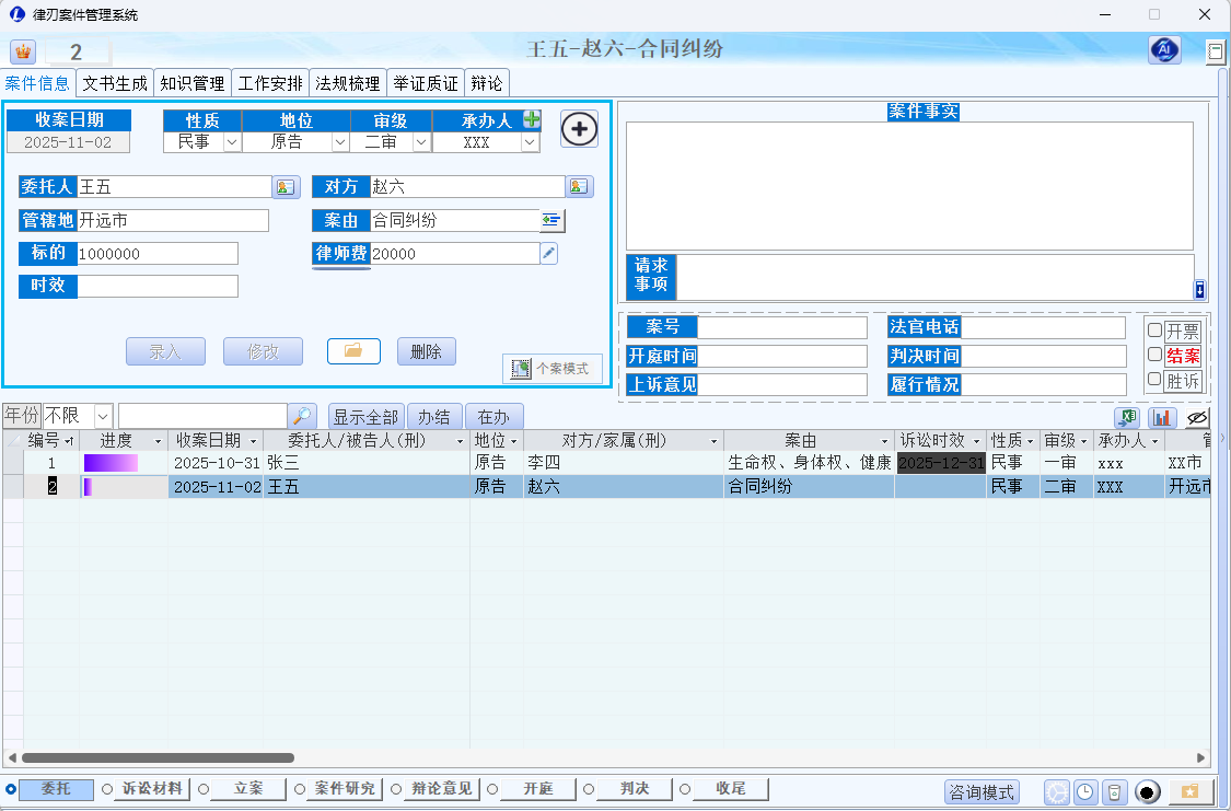 - 案件详情区:选中案件后显示委托人、对方、案由、管辖地、案号、收案日期、承办人等