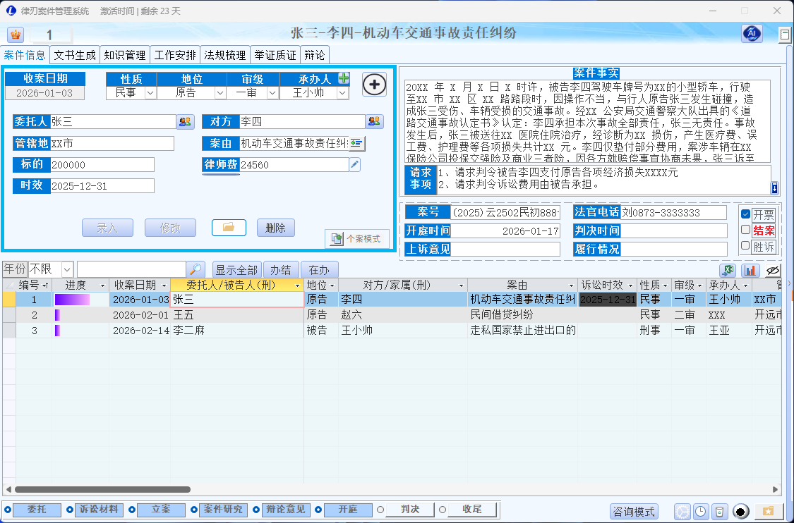 - 案件详情区:选中案件后显示委托人、对方、案由、管辖地、案号、收案日期、承办人等