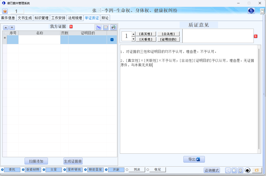 - 可快速生成质证意见模板,支持批量处理