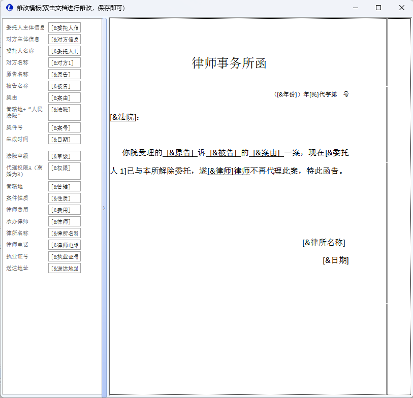 - 模板支持变量占位符,如 {案件名称}、{委托人}、{对方}、{案由}、{管辖}、{案号}、{日期}、{承办人} 等