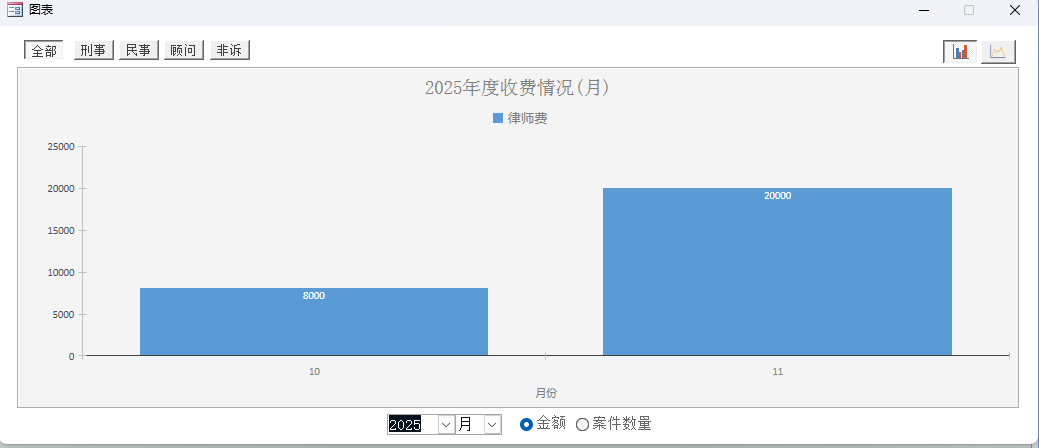 - 查看案件数量、类型分布、进度、业绩等统计图表