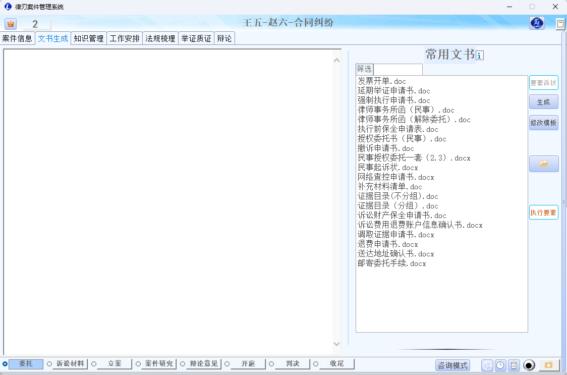 - 生成文书:选择起诉状、反诉状、答辩状、辩论意见、法律分析等,系统按当前案件信息生成初稿,可编辑、保存或导出