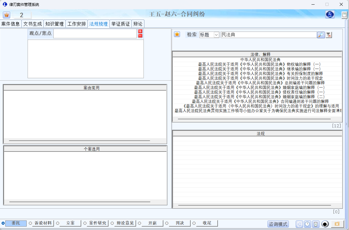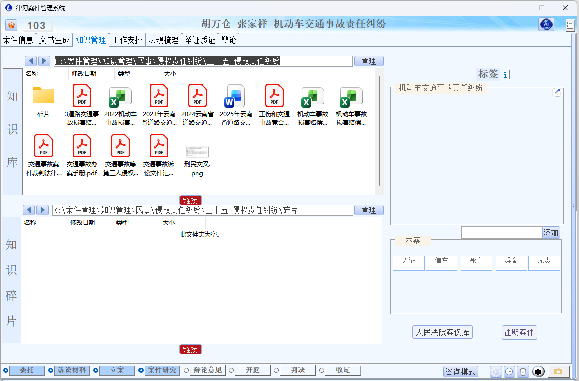 - 知识库管理:按案由分类的知识库,便于长期积累
