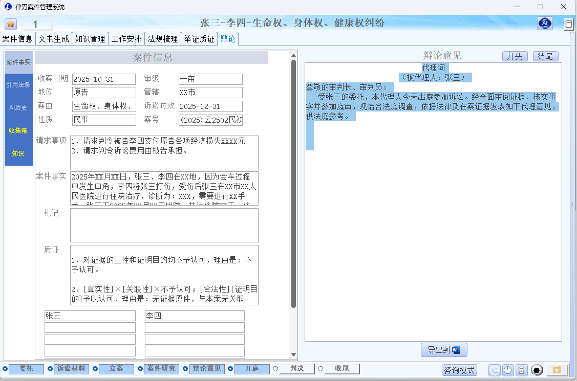 - 支持生成辩论意见初稿,再配合 AI 或文书模板完善